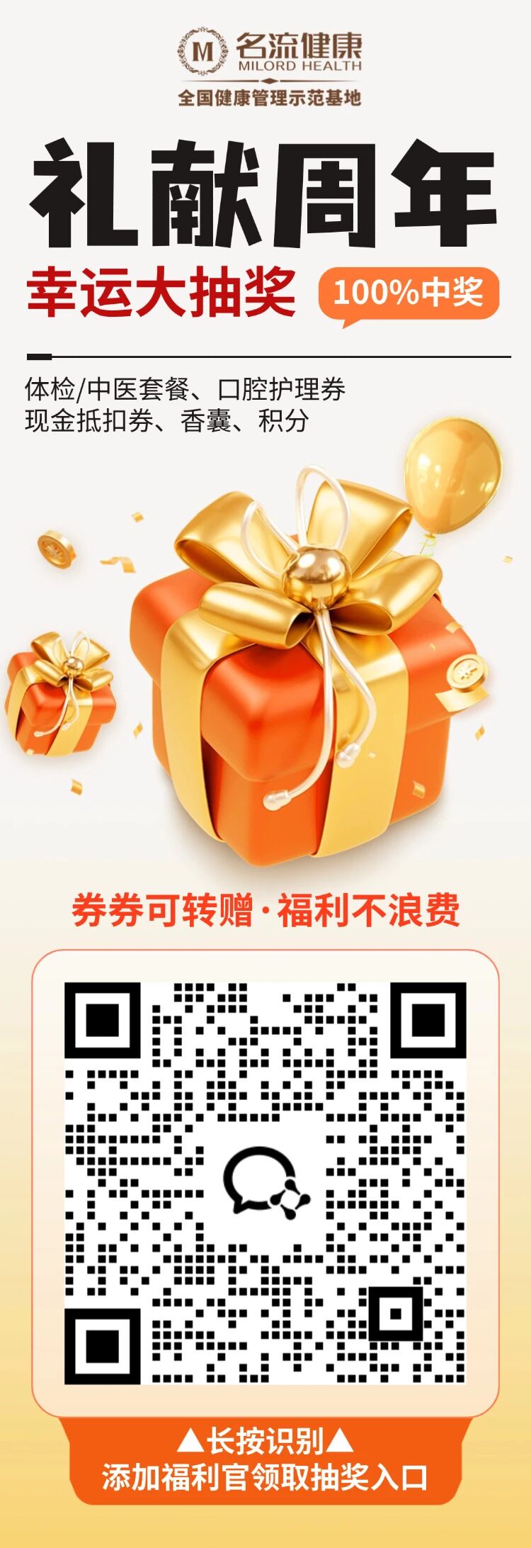 “检”张力拉满丨店庆幸运抽奖!100%中奖 日期:2025-09-22 / 人气: / 来源:未知 上一篇:以阅兵为镜强信念,以精神为炬践初心 —— 安徽名流健康管理有限公司党支部组织观礼“九三大阅兵”! ← 下一篇:名流健康丨2025年8月重要异常数据公示 → 推荐内容 Recommended 报告查询08-01 吃完饭就饿的人建议查查血糖!10-15 70%的胃癌与它有关!这类食品,多吃易增加感染概率!09-11 今日科普丨空腹吃荔枝,会得“荔枝病”?06-28 今天没出汗,可以不洗澡吗?06-12 相关内容 Related “检”张力拉满丨店庆幸运抽奖!100%中奖09-22 名流健康丨2025年8月重要异常数据公示09-18 以阅兵为镜强信念,以精神为炬践初心 —— 安徽名流健09-04 筑牢生命防线 急救能力再升级|名流健康开展生命支持技08-21 弘扬医师精神 共筑健康中国|名流健康第八届医师节主题08-19